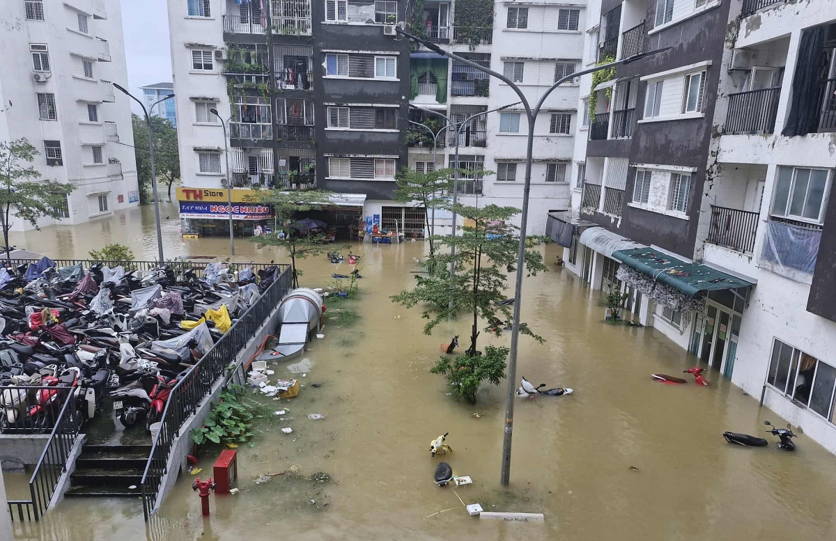 Nước lũ nhấn chìm nhiều xe máy của cư dân ở khu chung cư Vicoland ở phường Vỹ Dạ, đô thị An Vân Dương. Đây là một những vùng trũng của TP Huế, nơi thường ngập sâu khi mưa lớn, lũ về. Ảnh: Vạn An