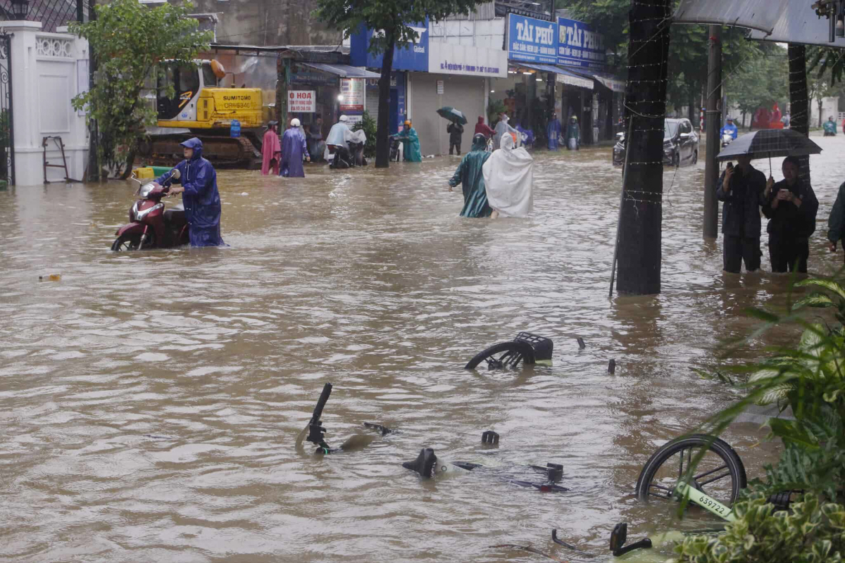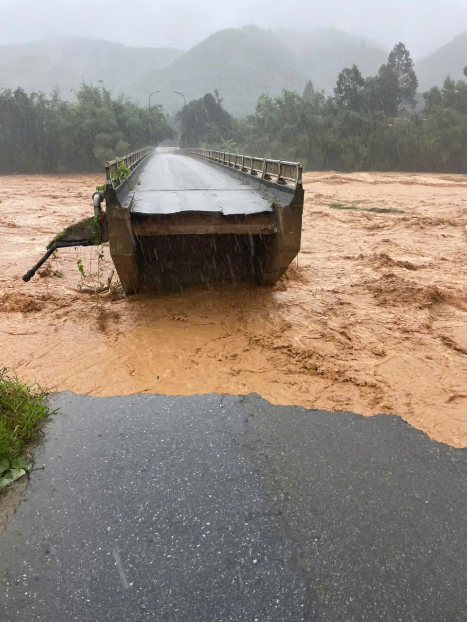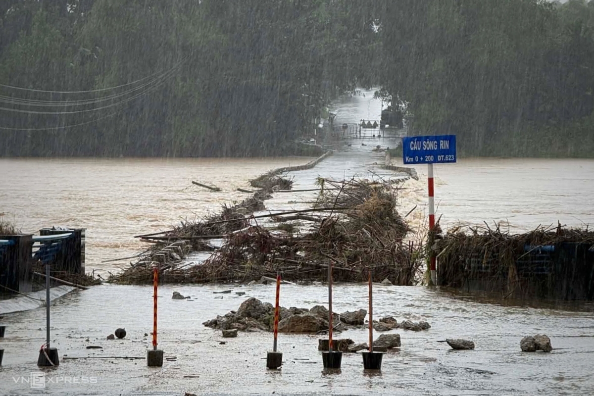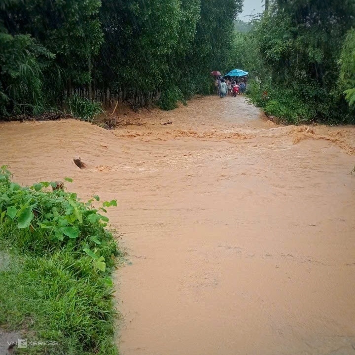 Dòng lũ bùn đỏ tràn qua một cây cầu nhỏ ở Sơn Hạ, xã miền núi của tỉnh Quảng Ngãi, người dân không thể đi lại.