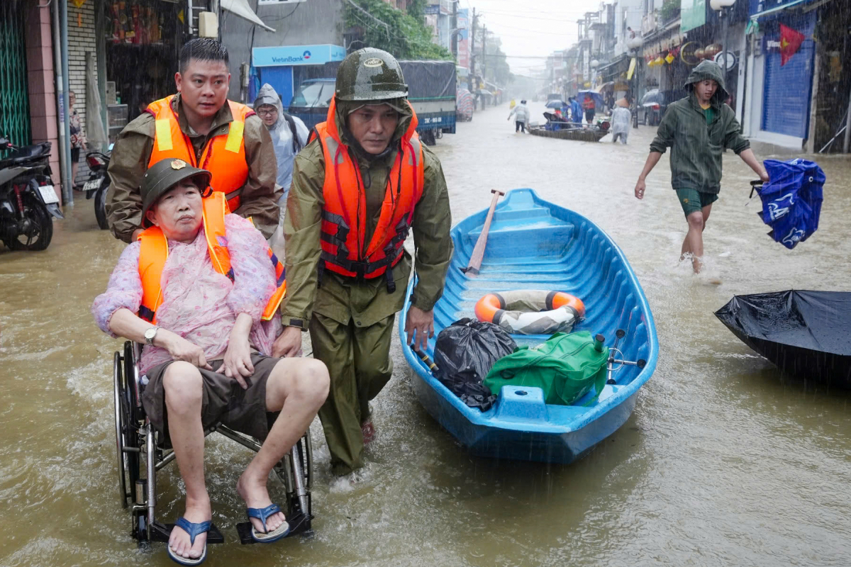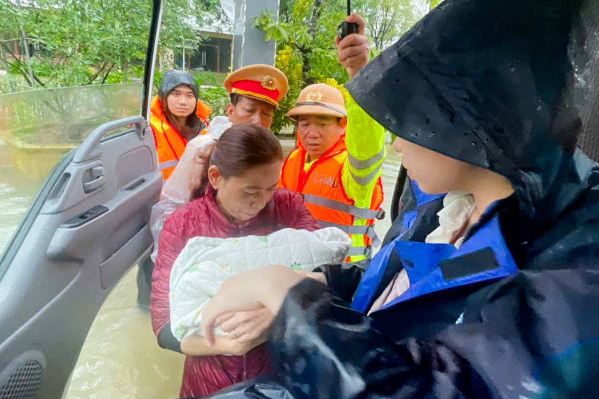 Sản phụ Hồ Hoàng Thi (mặc áo mưa đen) ở phường An Cựu mới sinh con 7 ngày tuổi. Nước tràn vào nhà 0,8 m, chị không có phương tiện di chuyển, được CSGT hỗ trợ đưa lên vùng cao. Ảnh: Vạn An