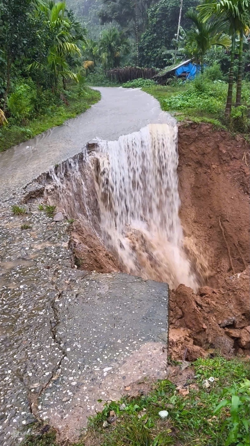 Đường ở thôn Trà Xuông, xã Tây Trà bị sụt lún dài 4 m, với chiều rộng bằng nửa mặt đường. Vị trí lún tạo thành hố sâu 4 m tiếp tục bị dòng nước lũ dội xuống. Thống kê của tỉnh Quảng Ngãi, đến chiều 27/10, toàn tỉnh có 30 vị trí sạt lở do mưa lũ. Ảnh: Phạm Linh