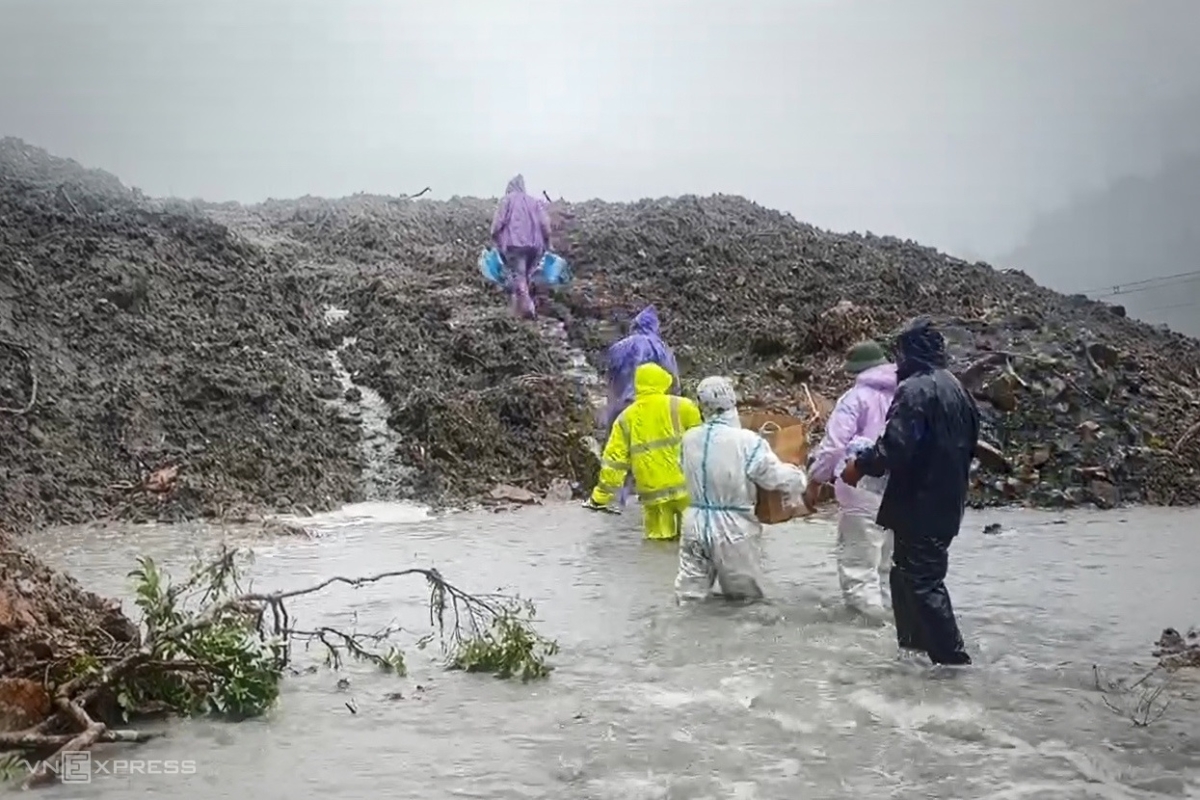 Nhóm người băng qua điểm sạt lở trên đèo Lò Xo tiếp tế cho người mắc kẹt hai ngày qua, do ôtô không thể di chuyển trên quốc lộ 14, đoạn phía tây Quảng Ngãi. Trước đó, nhiều xe phải dừng lại, nối dài vì sạt lở trên tuyến đường Hồ Chí Minh qua xã Đăk Plô và Đăk Pek.