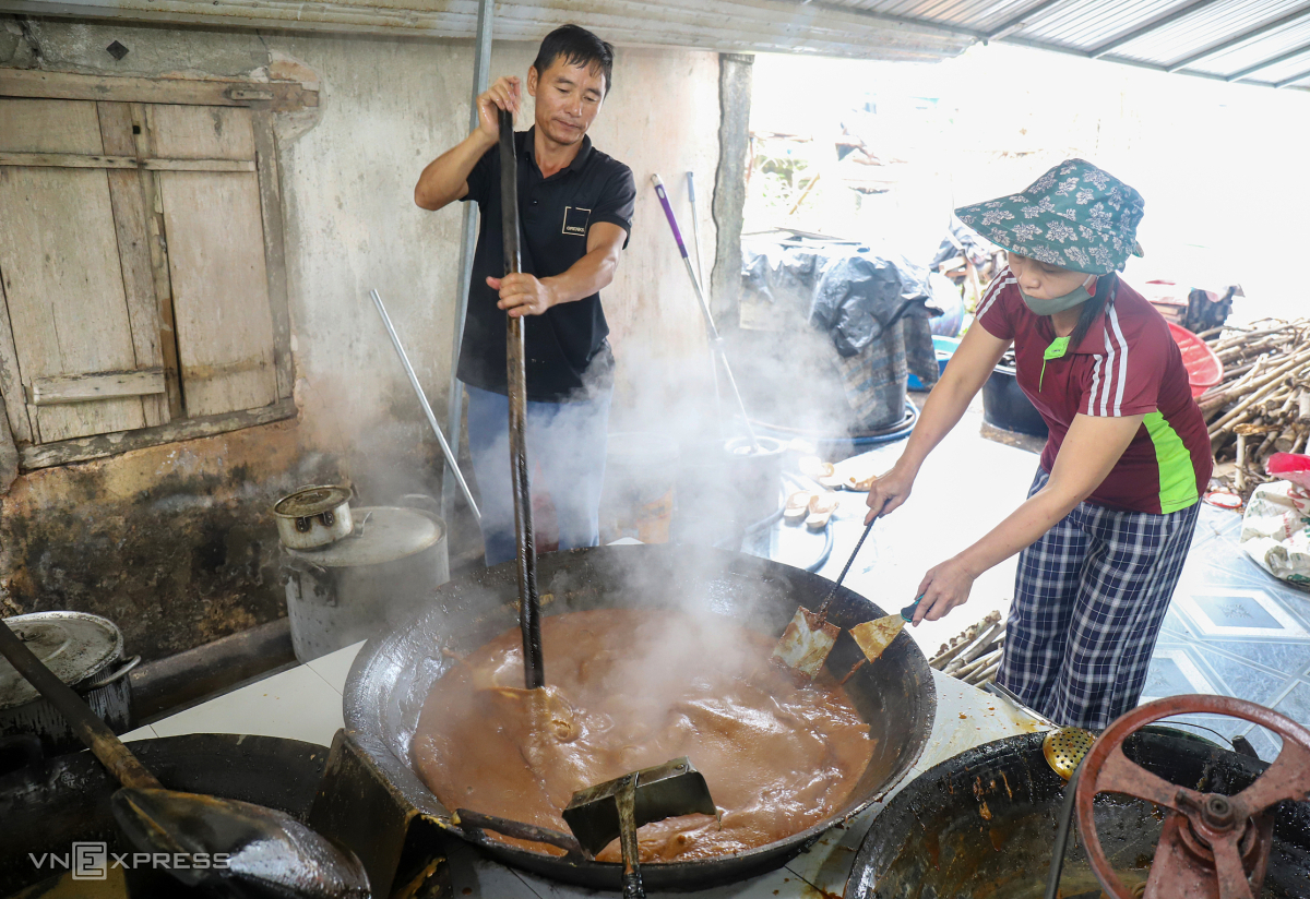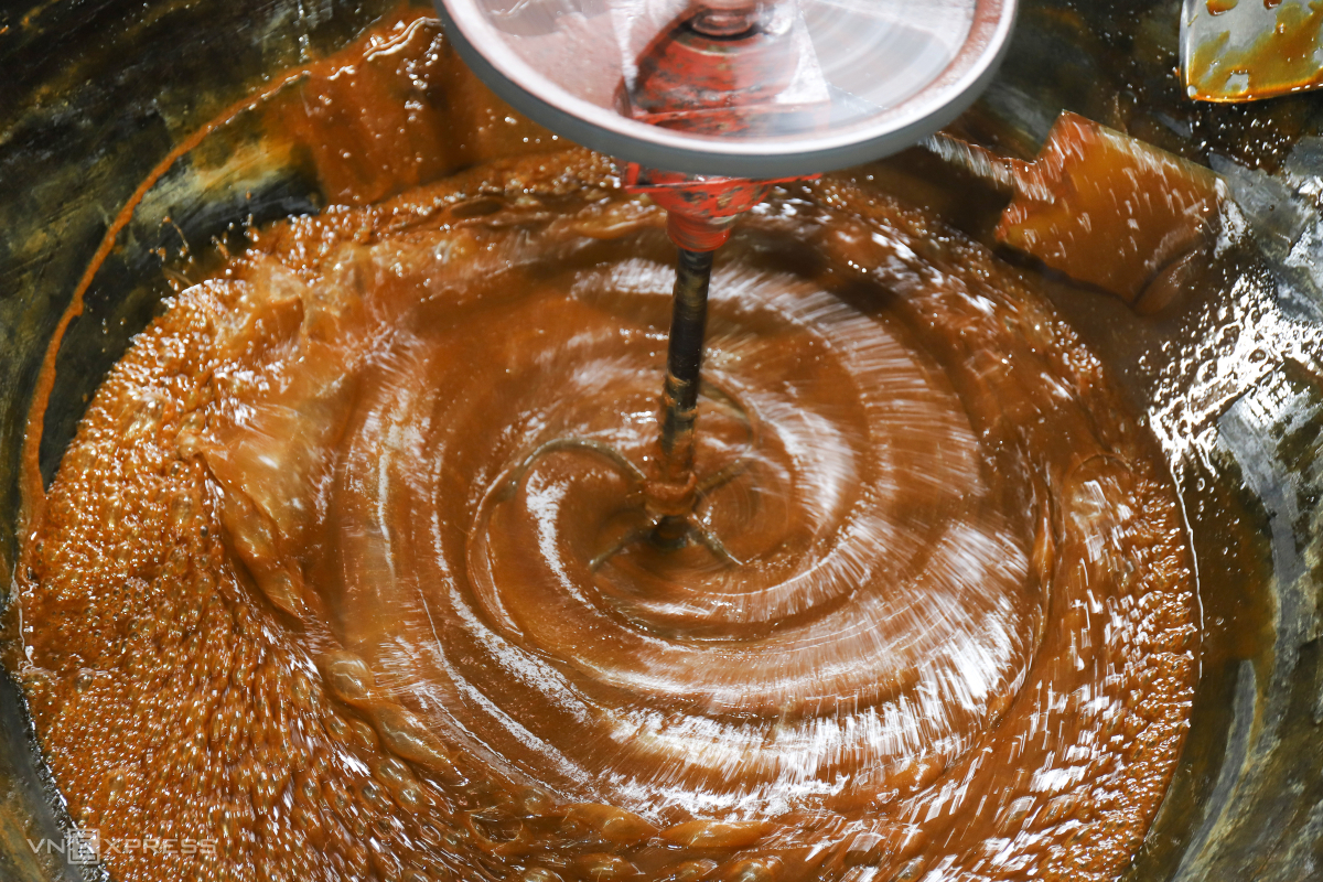 Mật được đổ vào chảo nấu trong khoảng một tiếng. Ở công đoạn này, vợ chồng anh Yên thay nhau đánh tan mật để tránh bị cháy. Anh Yên cho hay công đoạn nấu mật là quan trọng nhất. Thời gian cần được căn chuẩn, nếu sơ ý để mật cháy thì sẽ kém chất lượng.