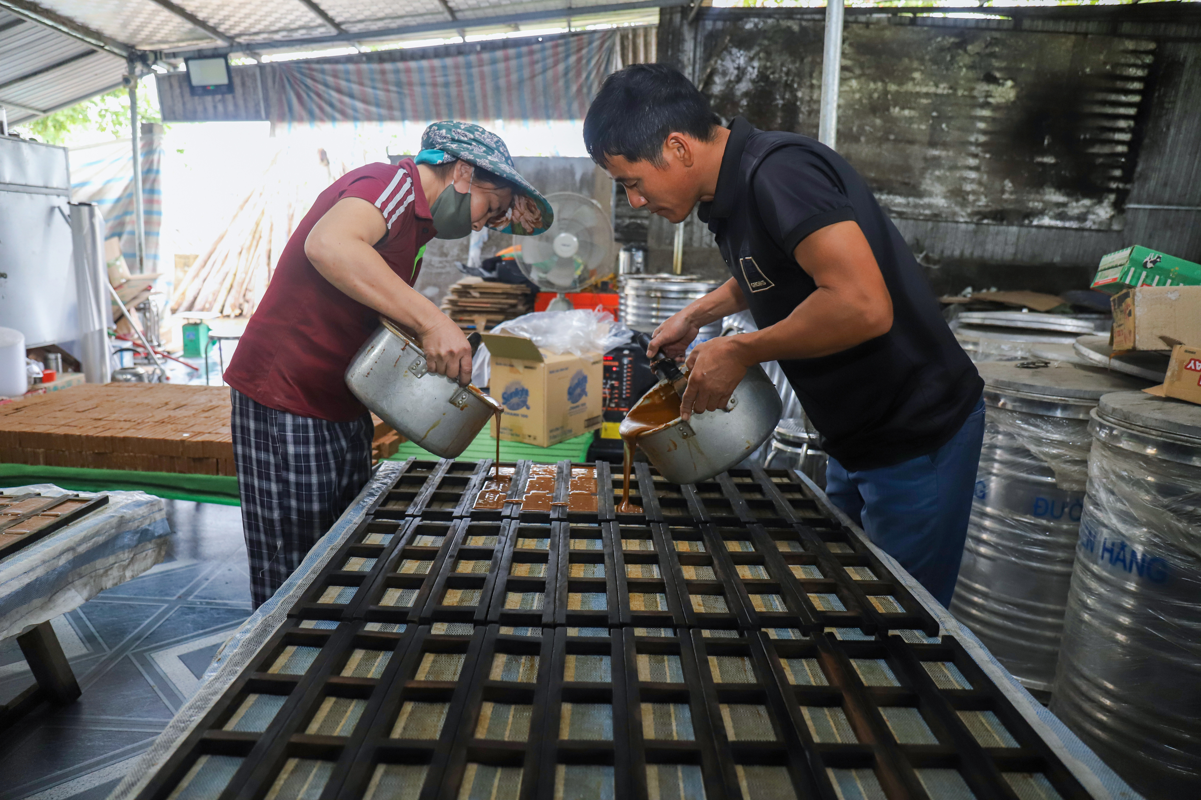 Mật chín đạt chuẩn được bỏ vào nồi nhôm, vợ chồng anh Yên thay phiên nhau đổ mật từ vào các khuôn gỗ.