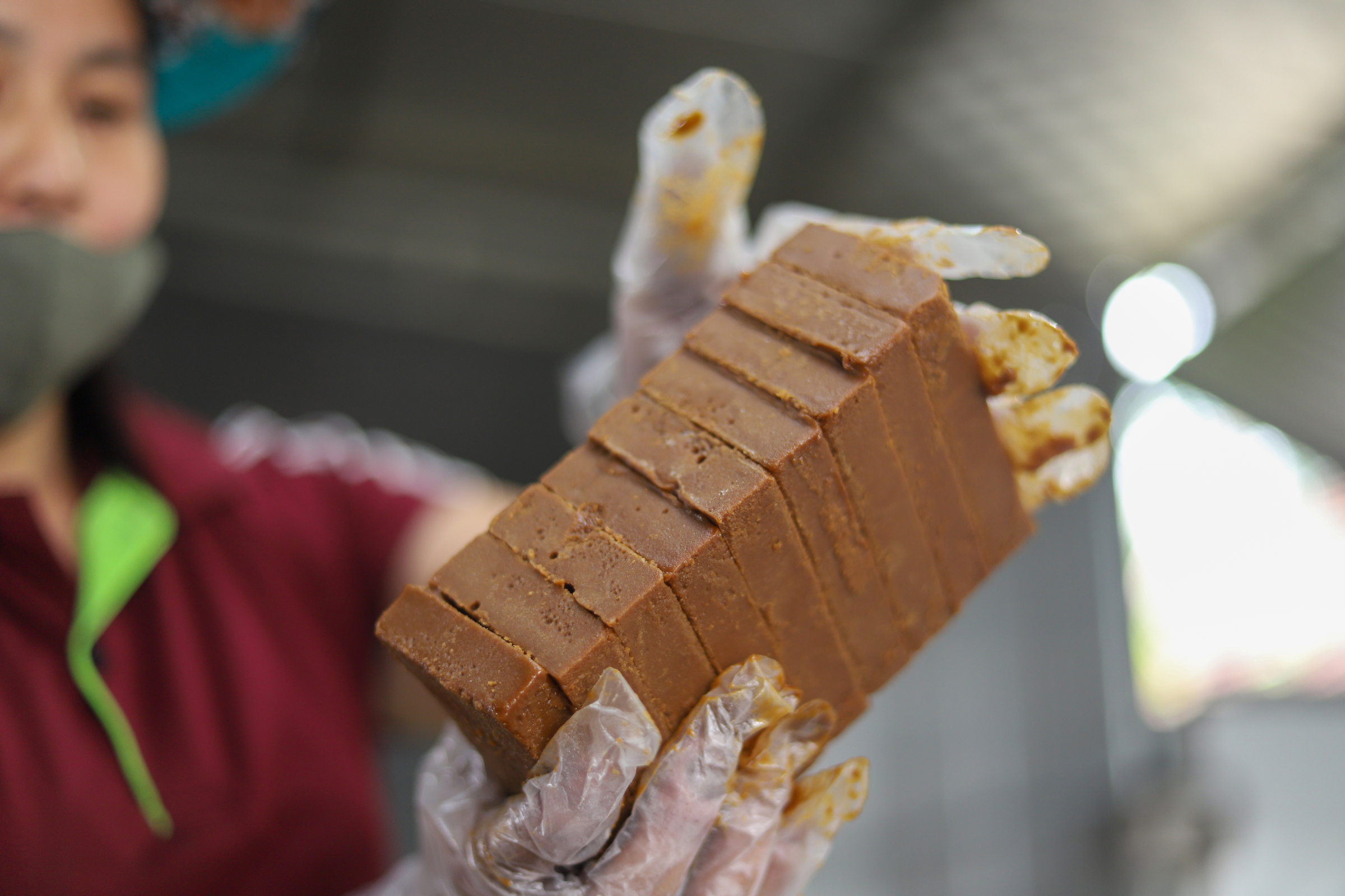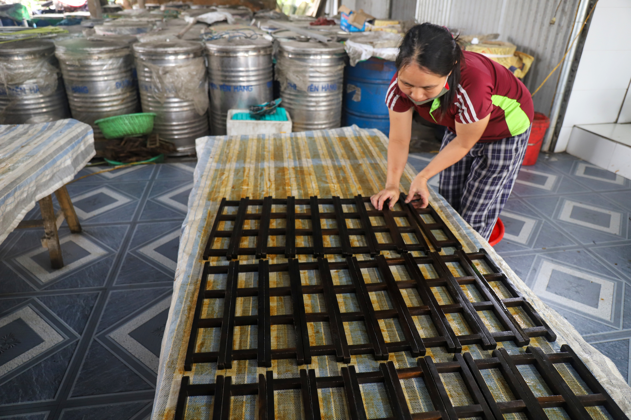 Chị Tần Thị Hằng, 43 tuổi, vợ anh Yên, sẽ dựng các tấm đường phên lại để cho khô các mặt trong khoảng 5 phút. Đường phên sau đó được xếp thành từng mẻ lớn để đóng gói.