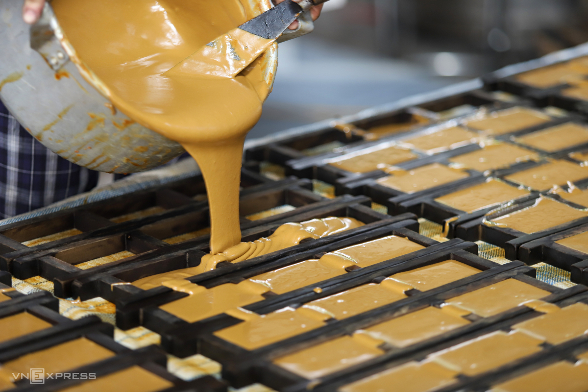 Sau khi đổ khuôn khoảng 15 phút, đường bắt đầu cô đặc, người thợ sẽ tháo khuôn.