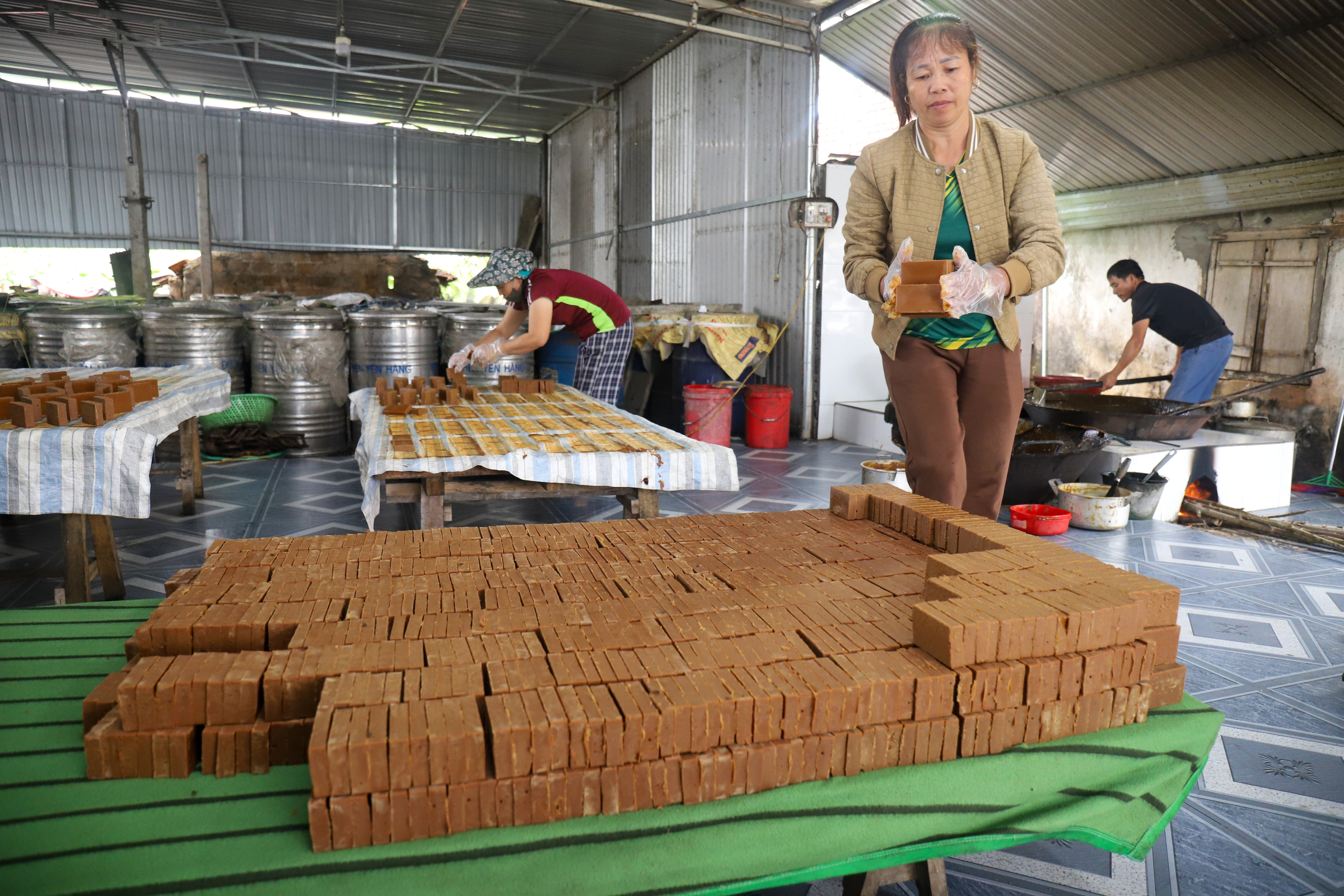 Tin gần xaNgười dân xã Nghĩa Hưng nấu mật mía đổ vào khuôn làm đường phên, bán 27.000-28.000 đồng một kg, thu nhập mỗi ngày khoảng 600.000 đồng.