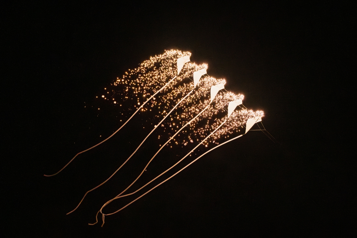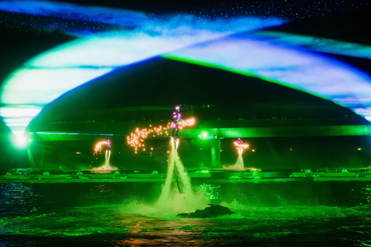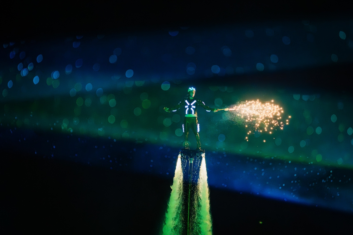 Nối tiếp là màn nhào lộn ở độ cao 15 m với trang phục đèn LED và pháo sáng của các ngôi sao flyboard.