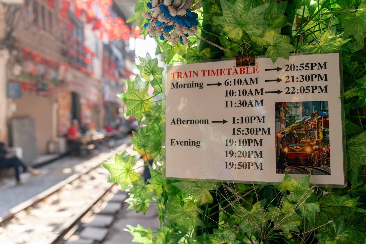 Chủ quán treo bảng giờ tàu chạy ở ngoài cửa để khách theo dõi.
