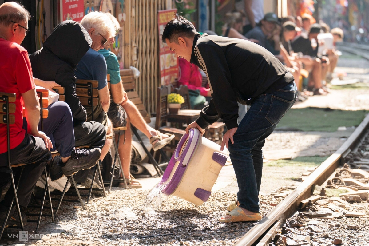 Khoảng 12h, tàu chuẩn bị đến nên các chủ quán cà phê đổ nước ra đường để tránh bụi bay.