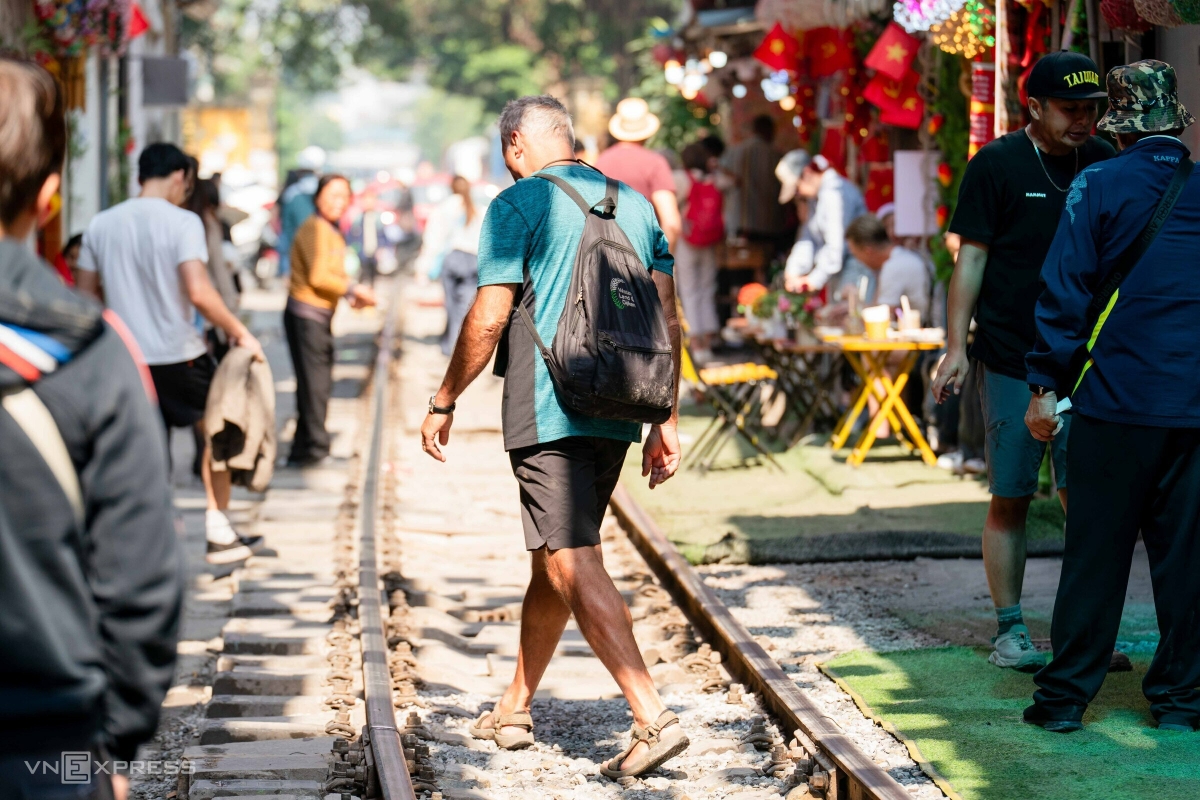Du khách đi bộ, chụp ảnh trên đường ray trước giờ tàu chạy. So với phố đường tàu Phùng Hưng, phố đường tàu Khâm Thiên ít khách hơn. Hàng quán ở đây cũng không trang trí nổi bật như phố còn lại.