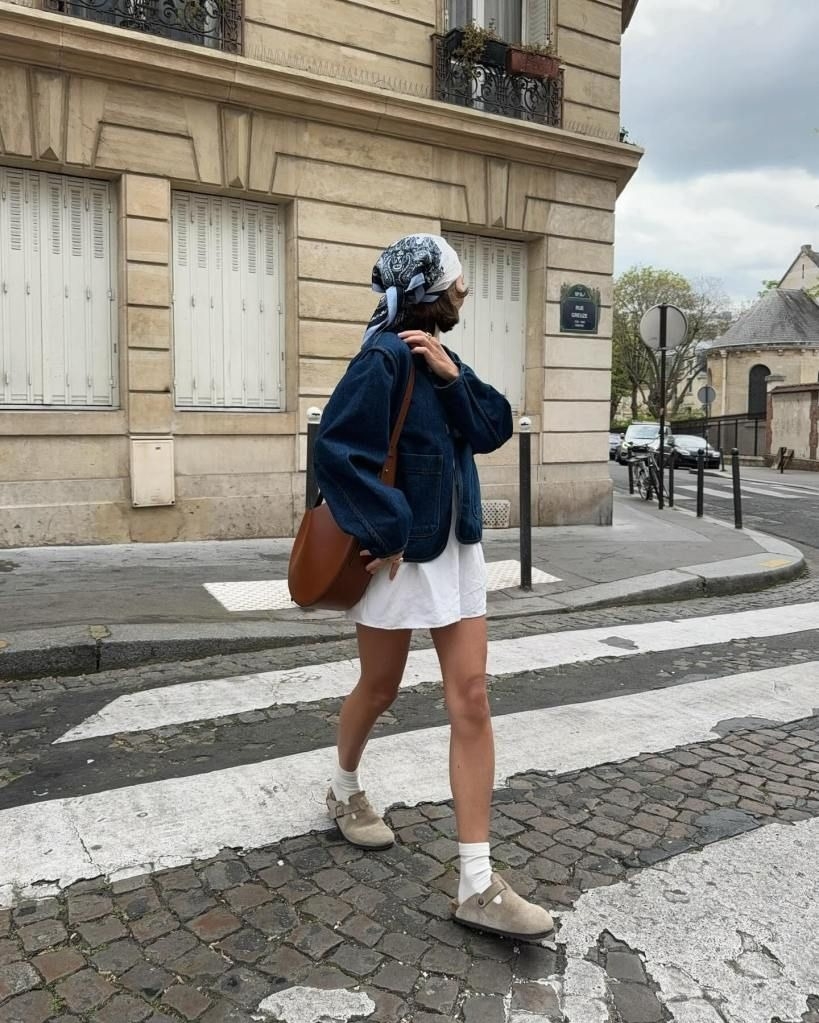 Với dép sục Birkenstock da lộn, bạn nên thêm tất trắng, kết hợp váy ngắn, áo khoác denim, hoặc quần jeans và áo khoác Harrington.