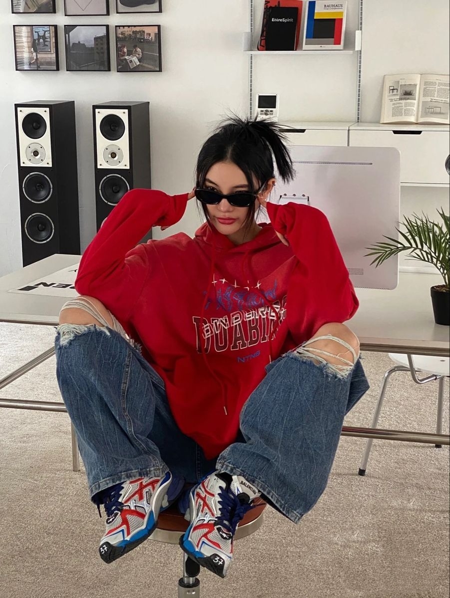 Giày thể thao dáng chunky theo kiểu "giày của bố" thường mang các đường nét rườm rà, tạo vẻ ngầu. Để làm nổi bật đôi giày tối đa, hãy chọn áo hoodie đơn giản và quần jeans ống rộng.