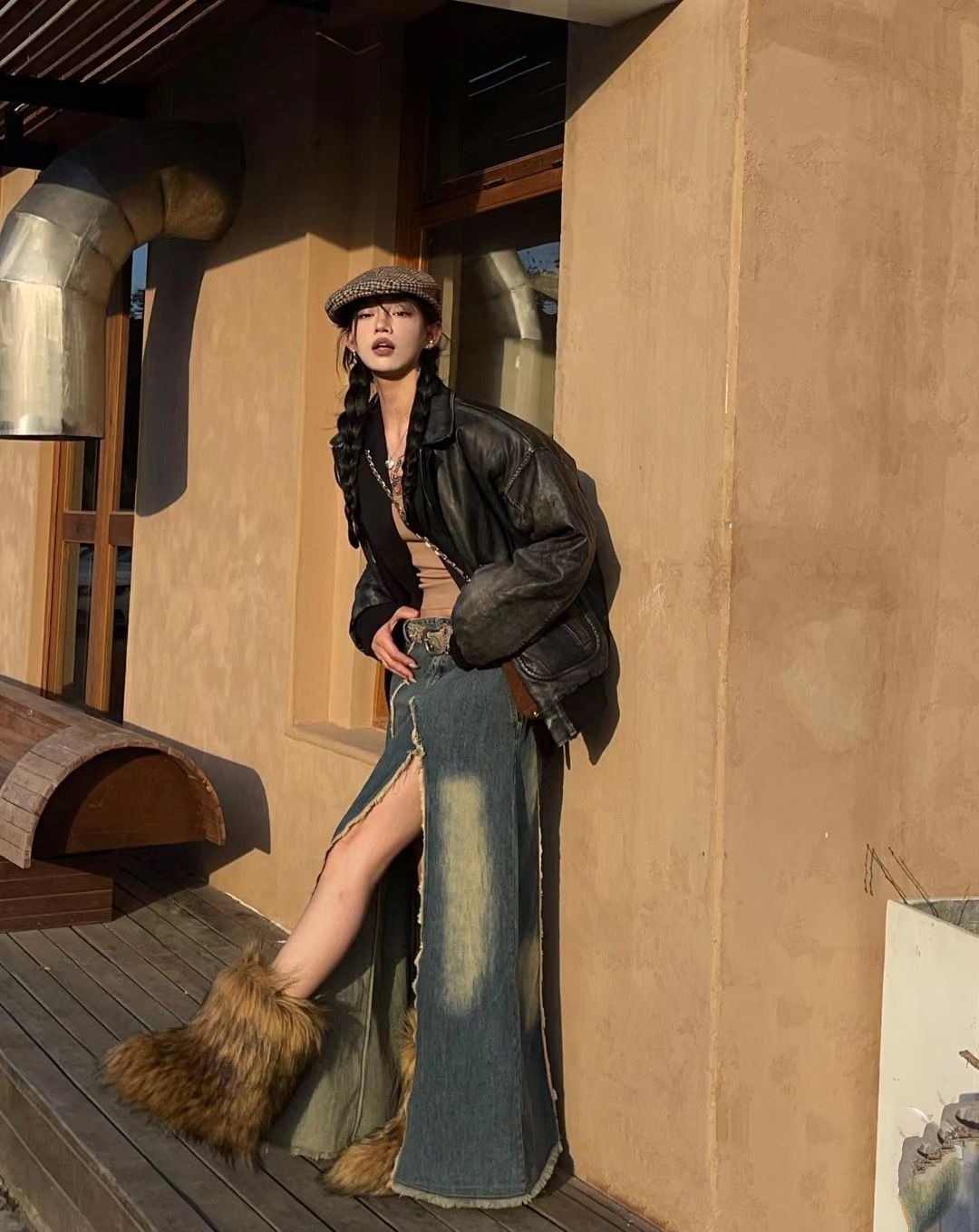 Giày lông quá khổ vốn nổi bật, nên bạn chỉ cần mặc trang phục đơn giản như áo phông, quần jeans, áo len cổ lọ trơn, kết hợp chân váy denim xẻ tà hoặc quần legging.