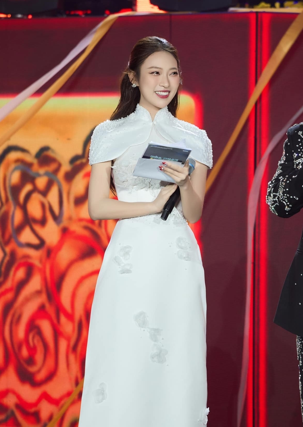 Tin gần xaKhánh Vy có gu thời trang linh hoạt, từ áo dài đến những bộ váy đuôi cá tôn nét tươi trẻ khi dẫn chương trình.